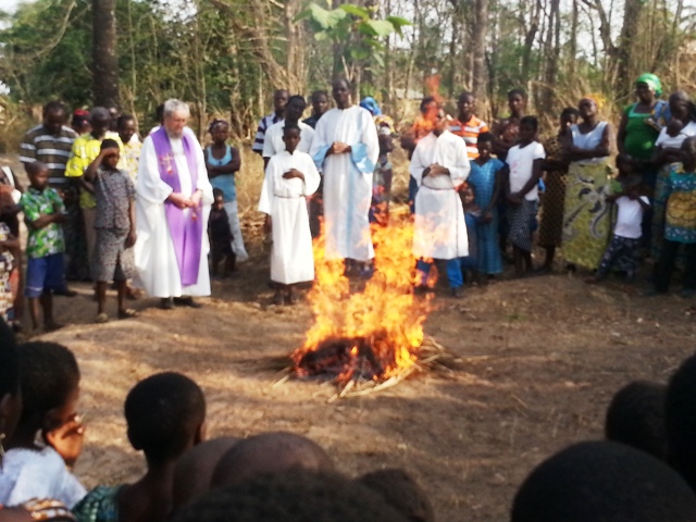 L'assemblea é raccolta in preghiera mentre il sacerdote benedice il fuoco e le fiamme, consumando le vecchie palme, distruggeranno anche il male che si è accumulato in noi e nel villaggio.